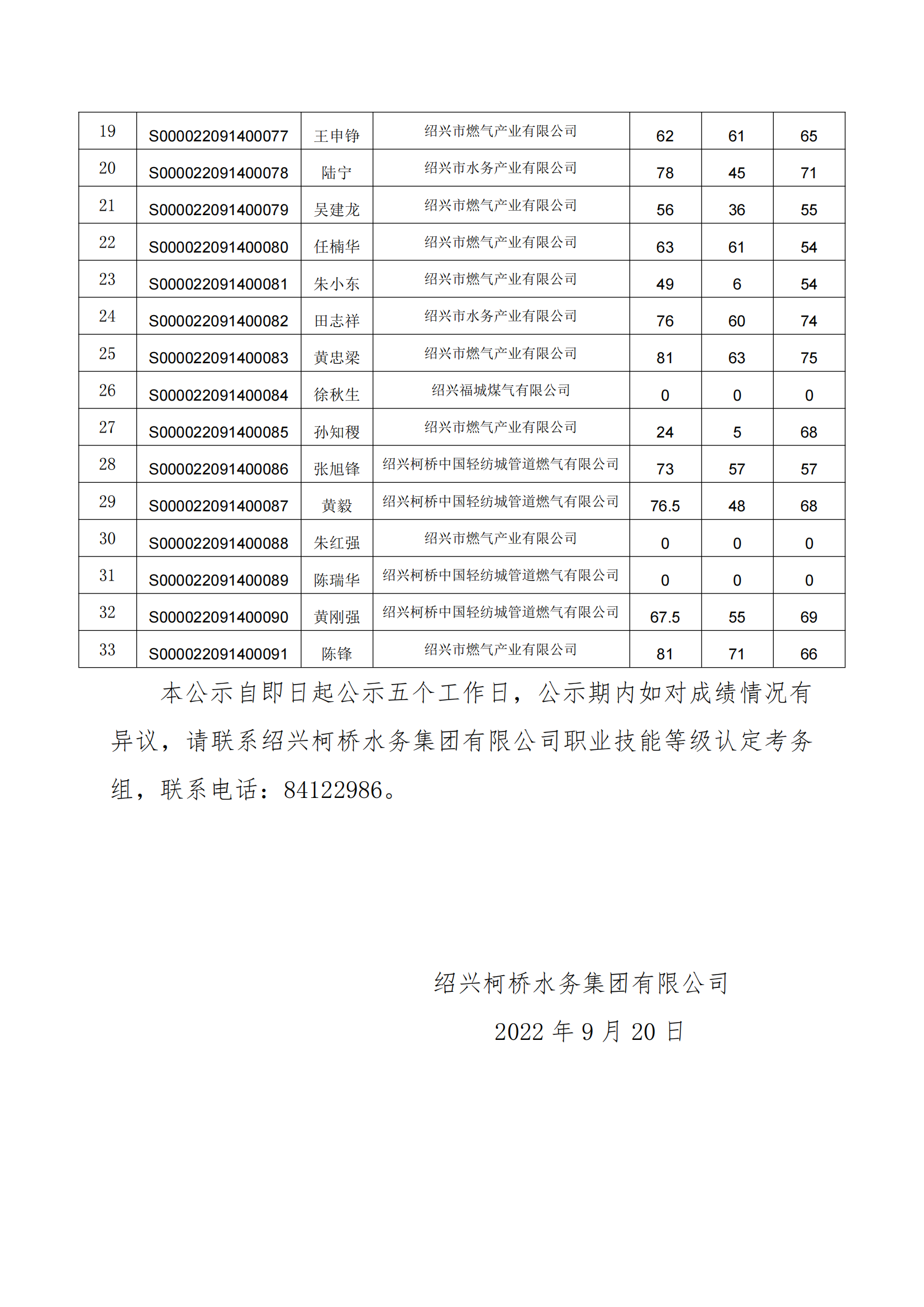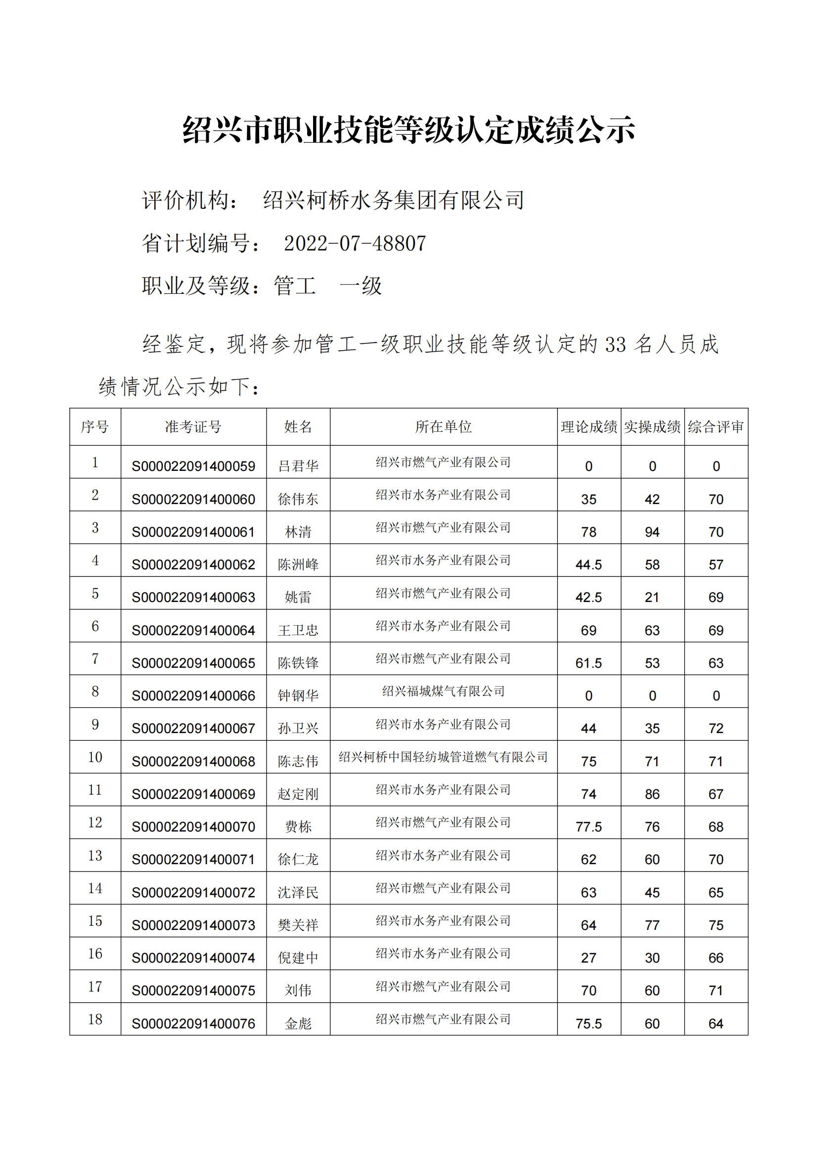 紹興市職業(yè)技能等級(jí)認(rèn)定成績公示(管工一級(jí))
