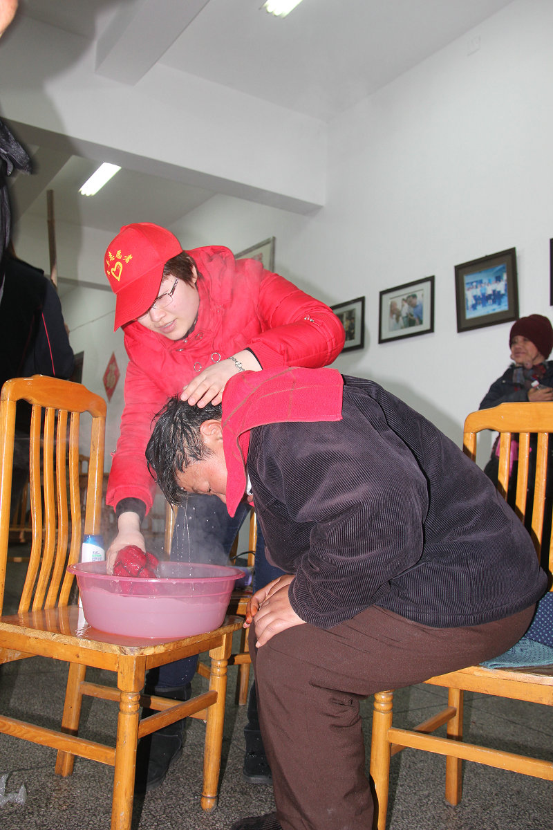 圖為集團(tuán)志愿者正在為柯橋夕陽紅中心老人洗頭