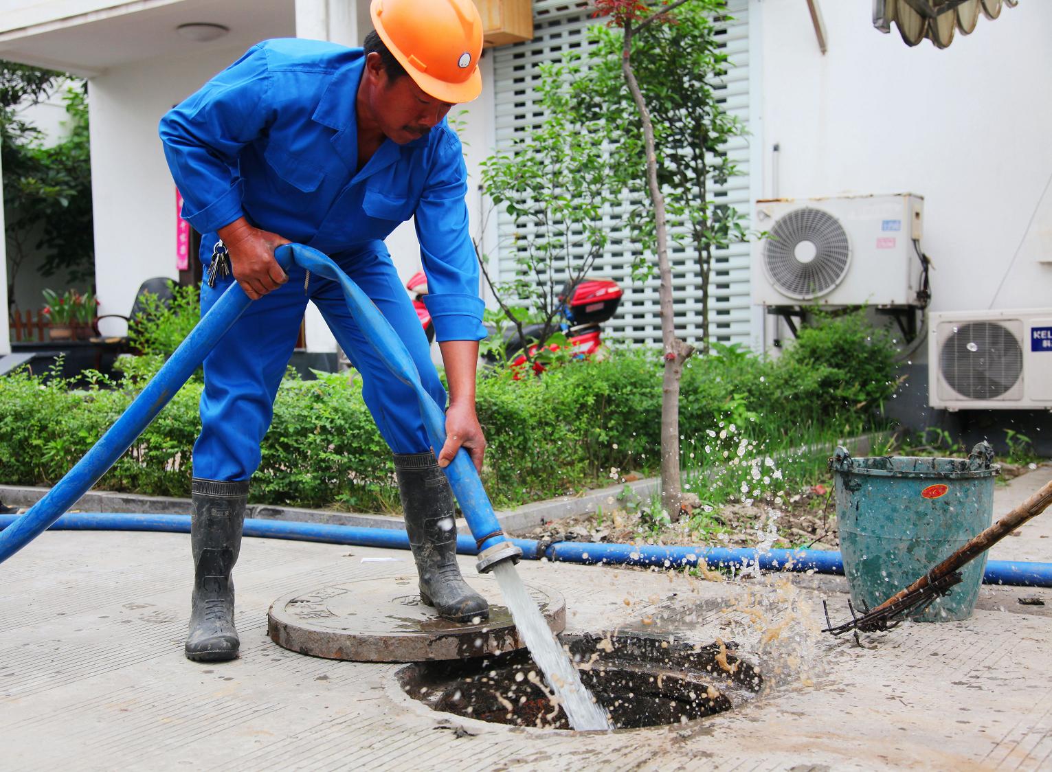 圖為施工人員正在對(duì)小區(qū)內(nèi)污水管道進(jìn)行疏通