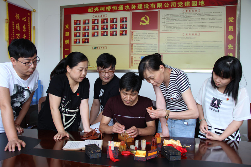 為進一步推進“兩學一做”學習教育,日前,恒通水務建設公司黨支部組織黨員以“黨在人民心中”為主題進行書法、篆刻創(chuàng)作,廣泛地吸引了黨員干部參與。圖為公司職工金偉勇在向黨員們傳授篆刻的竅門。