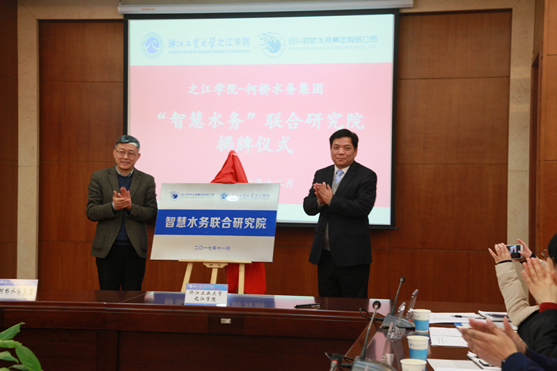 12月6日,柯橋水務(wù)集團—浙江工業(yè)大學(xué)之江學(xué)院全面戰(zhàn)略合作簽約暨“智慧水務(wù)”聯(lián)合研究院揭牌儀式在之江學(xué)院行健樓舉行。集團董事長周儉、副總經(jīng)理馮梁峰和各部室及下屬各單位負(fù)責(zé)人,之江學(xué)院院長李澎林、副院長王河江等出席儀式。周儉、李澎林一起為“智慧水務(wù)聯(lián)合研究院”揭牌,并分別致辭;馮梁峰、王河江分別代表雙方簽署合作協(xié)議。