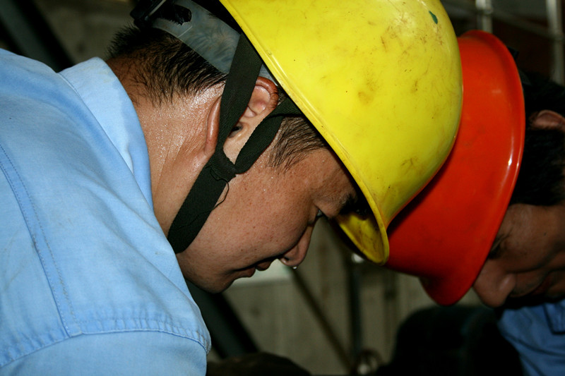 濱海供水公司管道安裝組在安濱路華豐接水安裝施工現(xiàn)場(chǎng)現(xiàn)場(chǎng)緊張作業(yè),40℃的高溫下,噪聲、火花與他們相伴相隨。