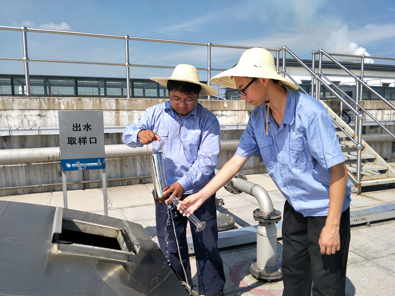 江濱水處理公司數(shù)米高的污水池上面,運(yùn)行二部的兩名職工頂著烈日取樣。