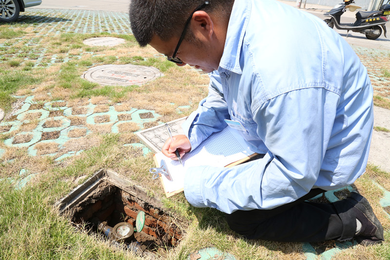 在室外火辣的太陽下,濱海供水公司抄表員一次次地抬起表蓋,記錄數(shù)據(jù)。
