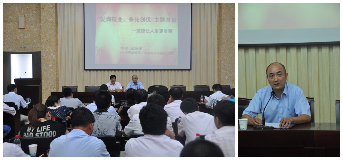 8月11日下午,公司邀請(qǐng)全國(guó)勞動(dòng)模范、紹興市制水公司副總經(jīng)理徐海根為公司班組長(zhǎng)以上管理干部作題為《道德讓人生更美麗》的宣講教育,共80余人聆聽了模范的精彩宣講。會(huì)上,徐海根結(jié)合自身工作實(shí)際,用樸實(shí)的語(yǔ)言從職業(yè)道德、責(zé)任心、愛崗敬業(yè)等方面講述親身經(jīng)歷的感人故事,感人至深,催人奮進(jìn)。與會(huì)的每個(gè)人在這里接受了一次心靈的洗禮,取得較好的效果。