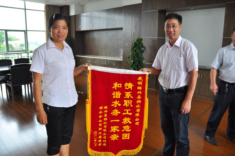 8月17日上午,柯西分公司職工莫煜君在分公司經(jīng)理田長(zhǎng)榮及其所在村村支書的陪同下來到公司送上一面“情系職工救危困,和諧水務(wù)一家親”的錦旗,感謝公司對(duì)她的關(guān)愛和幫助。