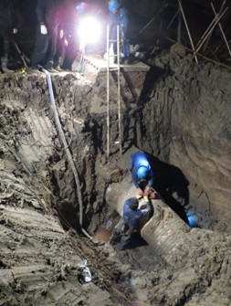 11月23日,濱海北側(cè)泵站DN500進(jìn)水管多處斷裂,導(dǎo)致濱海興濱路華納藥業(yè)門口的綠化帶上出現(xiàn)了一條長50米,寬3米深1米的溝壑,情況十分危險。維修分公司立即組織人員趕赴現(xiàn)場勘察,面對路面濕滑結(jié)冰;高壓電線、水管光纜錯綜復(fù)雜;管道破損區(qū)域廣、埋藏深度深等困難,維修員們早出晚歸,每天工作12小時,歷時17天,修復(fù)管道一百三十余米,終于在12月8日,順利完成濱海興濱路DN500管搶修工作。