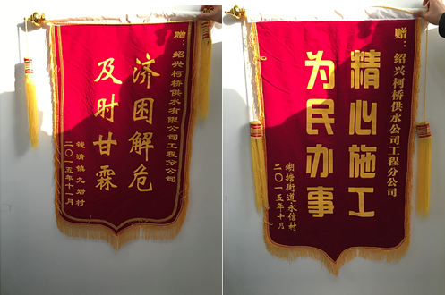 1229日下午,公司相繼收到湖塘街道永信村和錢清九巖村村委送來的“濟(jì)困解危,及時(shí)甘霖”和“精心施工,為民辦事”兩面錦旗,對(duì)工程分公司工作人員辛勤勞動(dòng)、甘于奉獻(xiàn)的工作精神表示贊賞和感謝。