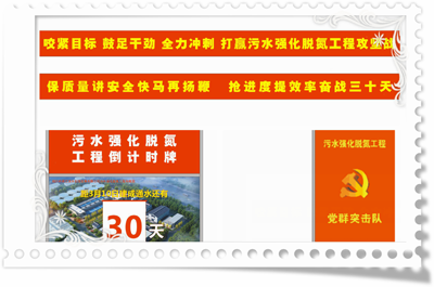 目前,在污水強(qiáng)化脫氮工程現(xiàn)場明顯位置,已樹立工程沖刺倒計時牌。公司要求,各級領(lǐng)導(dǎo)干部人員必須清醒認(rèn)識到形勢嚴(yán)峻,要在最后1個月的時間里拿出更大的干勁全面沖刺,確保工程建設(shè)任務(wù)的按期完成。同時,公司黨支部錢書記也特別強(qiáng)調(diào),要充分發(fā)揚黨員干部先鋒模范帶頭作用,使廣大黨員平常時候看得出來、關(guān)鍵時刻站得出來、危急關(guān)頭豁得出去,要將把黨的政治優(yōu)勢轉(zhuǎn)化為項目推進(jìn)優(yōu)勢,把黨建力量凝聚為奮斗合力,確保工程順利建成通水。